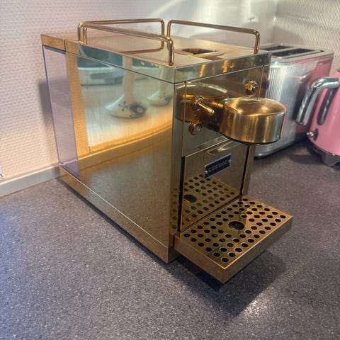 Maskinen bruger kaffekapsler (Nespresso-kompatibel) og laver rigtig god espresso med flot crema. Den er både praktisk og et pænt designelement i køkkenet.