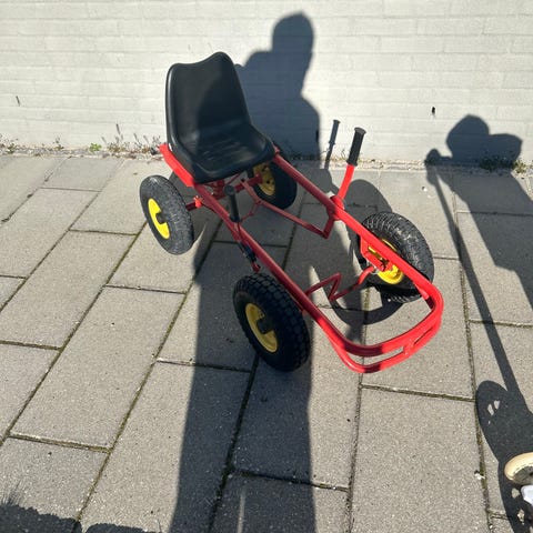 gokart til børn i rød og sort. Gokarten har fire hjul, plastiksæde og ratstyring. Trædes frem med pedaler og har metalstel. Egnet til udendørs leg for børn, som kan nå pedaler og rat. Der er lidt maling på rettet og lidt rust hist /pist