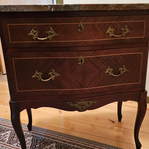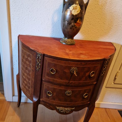 Sælger denne utroligt elegante og velholdte kommode, der med sine svungne former og detaljerede håndværk tilføjer masser af karakter til hjemmet. Kommoden er udført i klassisk fransk/italiensk Louis XV-stil (rokoko-inspireret) og er rigt prydet med smukt intarsia-arbejde (indlagte træmønstre) på både skuffer og sider.