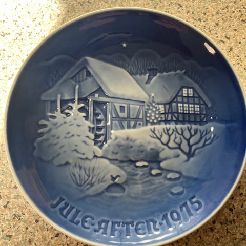 Bing & Grøndahl juleplatte "Juleaften 1925" i porcelæn. Platten er udført i blå-hvide nuancer og viser et motiv af to personer foran et juletræ med lys og stjerne. Årstallet 1925 og teksten "Juleaften" er integreret i motivets kant. Bagsiden har Bing & Grøndahl stempel og ophængshuller, så den kan hænges på væggen som dekoration.