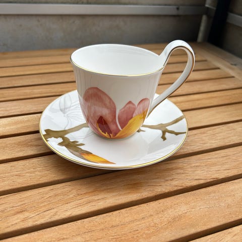 Royal Copenhagen Magnolie kaffekop med underkop og lille tallerken i porcelæn. Sættet har blomstermotiv med magnoliegren i rosa, gule og grønne nuancer på hvid bund. Koppen har hank og leveres med matchende underkop, begge med samme motiv. Tallerkenen har rund form og dekoreret kant. Velegnet til servering af kaffe, te og kage. Serien er mærket med Royal Copenhagen stempel og navnet "Magnolie" på undersiden.