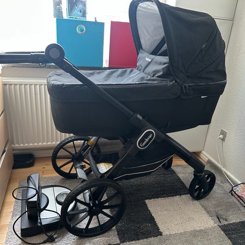 Den har ingen skimmel, fugt eller pletter og heller ikke rust. Ikke falmet i farven. Medfølger madras, regnslag og en sele.