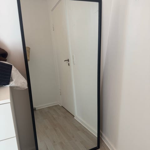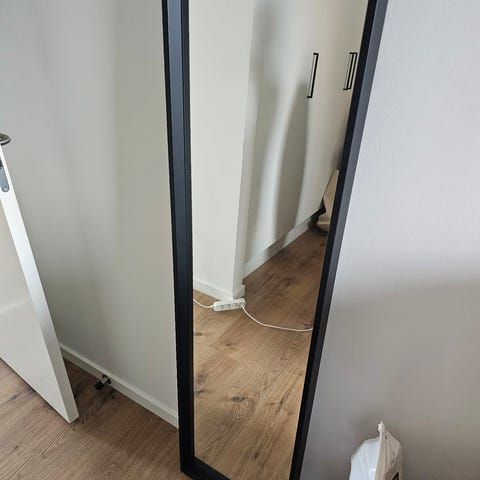 Jysk spejl med sort ramme. Rektangulært spejl egnet til ophæng eller opstilling i gang, soveværelse eller andre rum, hvor der er behov for et helkropsspejl. Neutral sort ramme, der passer ind i de fleste indretninger.