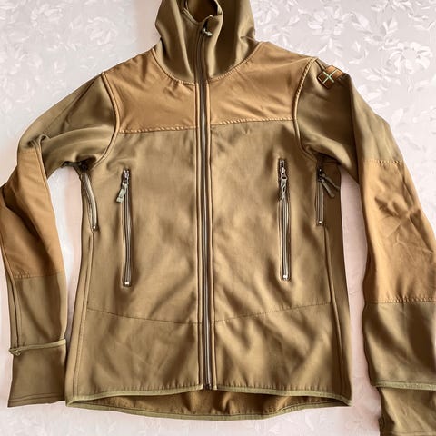 Jeg har en softshell jakke som der ikke bliver brugt mere den er uden huller eller fejl på lynlås den er intakt med hætte aftagelig der kan se lægges ind i graven med stor lomme der er tilgængelig på begge sider omme på ryggen, nummer på ærmerne og brystlommer. forekommer på billederne.