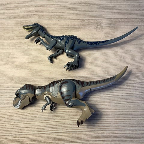 2 stk. Lego krokodiller. Den ene med malede øjne.