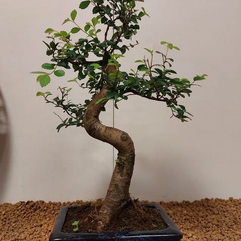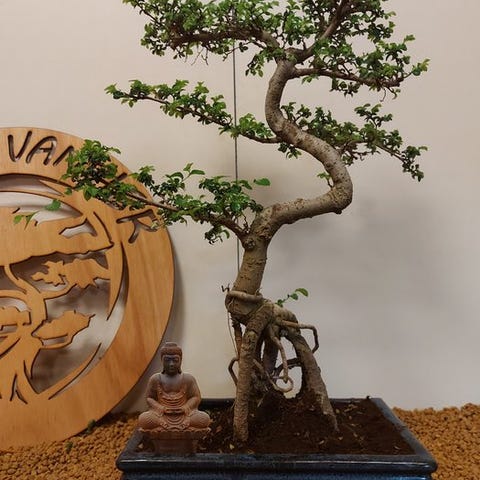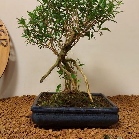 Serissa-bonsai, også kendt som 'Tusindstjernetræet', betager med sine fine blade og utallige små, hvide blomster, der synes at funkle som stjerner. Denne elegante fremtoning blomstrer flere gange om året og bringer igen og igen et strejf af magi ind i hjemmet.
