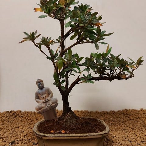Azalea-bonsai er et virkelig lille kunstværk fra naturen. Med sin overflod af farverige blomster – fra sart lyserød til flammende rød – fortryller den enhver tilskuer og bringer et strejf af forår ind i hjemmet, uanset sæson. Denne bonsai står som symbol på kvindelighed, ømhed og skønhed, men misforstå ikke: den kræver kærlig pleje og opmærksomhed. Til gengæld overrasker den dig med en spektakulær blomstring, der gør den endnu mere særlig hver gang. En Azalea-bonsai er ikke bare en plante – det er et levende smykke, et lille digt på ben.