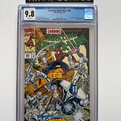 CGC 9.8 - 3. udseende af Carnage, The Amazing Spider-Man #363, første udgave, bedømt tegneserie, kunstnere Mark Bagley, Randy Emberlin og David Michelinie, tilstand Mint. Klik på den blå "gå til varen" knap, for at købe eller byde på denne vare. Den samlede pris vil blive vist inden du afgiver dit bud.