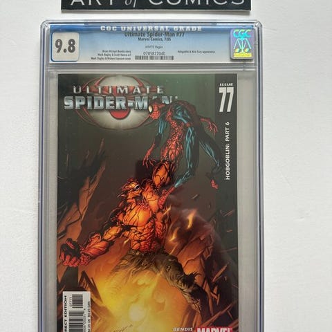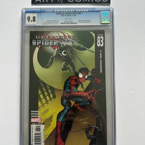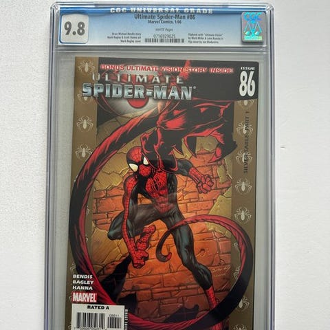 CGC 9.8 vurderet Mint første udgave af Ultimate Spider-Man nr. 92 med X‑Men og Deadpool, udgivet af Marvel Comics i 2006, hæftet binding, kunstnere Mark Bagley, John Dell og Brian Michael Bendis. Klik på den blå "gå til varen" knap, for at købe eller byde på denne vare. Den samlede pris vil blive vist inden du afgiver dit bud.