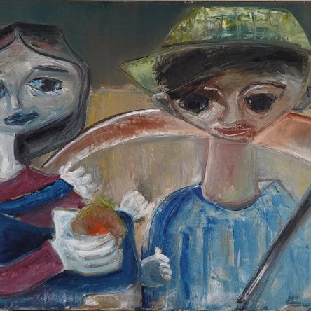 Olie på lærred af Joël Dabin dateret 1964. Dette værk tilhører kunstnerens efterkrigsperiode, karakteriseret ved en ekspressiv penselstrøg og en rig, massefyldt overflade.