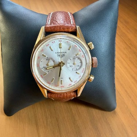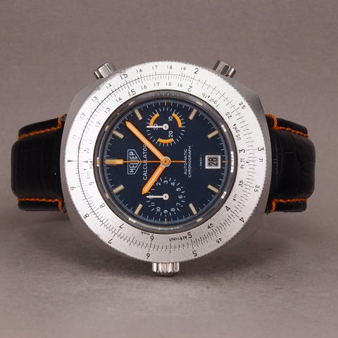 Tilbydes Heuer Calculator Chronograph original fra 1970’erne, et af mærkets mest ikoniske og eftertragtede modeller, særligt værdsat af samlere af vintage sportschronografer.