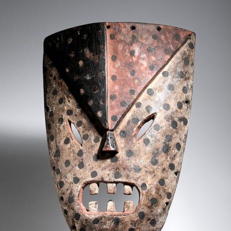 Denne N’Golo-maske fra Marka-Soninké er delvist dækket af metalplader med geometriske mønstre og har også to lange fletninger lavet af små rør af samme metal, fastgjort ved begyndelsen af brynene og løbende ned ad kinderne, som afsluttes med stykker rødt stof. Med et design der praktisk talt er ”kubistisk”, ligner denne maske i bred udstrækning Bambara-masker fra N'Tomo-samfundet: et langt, tyndt ansigt, en skarp, spids næse der deler ansigtet i to symmetriske dele, og en høj, bulende pande hvis masse dominerer den nedre del af ansigtet og hvorfra to små, lige, vertikale horn rejser sig, som tilspidses mod spidserne og giver masken mulighed for at klassificeres som