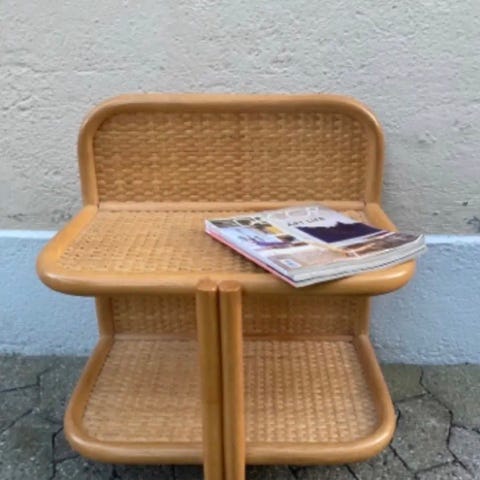 Italienskfremstillet par væghængte kommoder / konsol i Mid-Century Modern-stil, cirka 1960–1970, med fletningsramme og spundet bananblade-top, i god brugt stand med mindre aldersmærker og pletter, 43 cm bredde, 22 cm dybde, 23 cm højde, vægt 420 g. Klik på den blå "gå til varen" knap, for at købe eller byde på denne vare. Den samlede pris vil blive vist inden du afgiver dit bud.