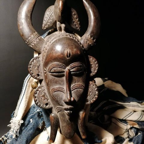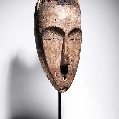 Traditionel maske "Tsangui" Punu i Ceiba Pentandra-træ og kaolin. Disse masker blev båret af en danser på stænger, som svingede piskene af rafia, han standsede foran en borger og råbte: "jeg kender din hemmelighed, og hvis du ikke betaler mig, vil jeg råbe det ud for hele verden". Det var tydeligvis sådan, at næsten alle havde en hemmelighed at skjule, og de tilbød hurtigt en sæk hirse eller en kylling, osv. I dag består denne tradition stadig, og selvom den er mere en festival end en manøvre til at afsløre hemmeligheder, giver folk en smule penge til de maskerede, og alle fejrer det. Højde: 28 cm.