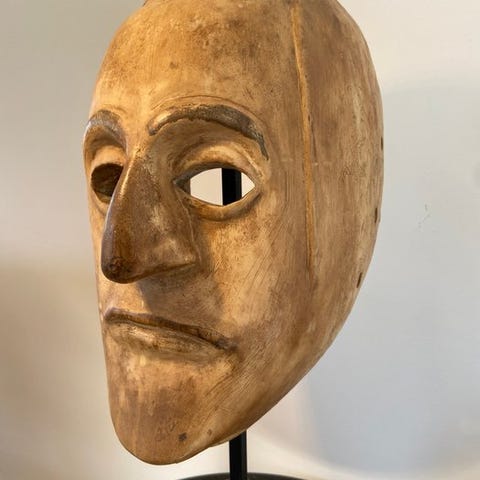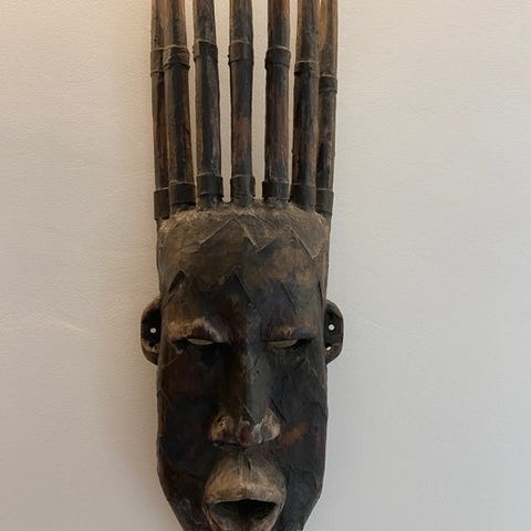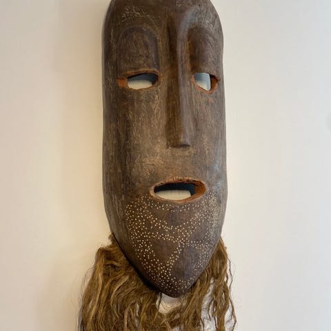Ngil maske, træ, Kamerun, Fang-kultur, periode midten af det 20. århundrede, højde 58 cm, i god stand, fra privat samling. Klik på den blå "gå til varen" knap, for at købe eller byde på denne vare. Den samlede pris vil blive vist inden du afgiver dit bud.