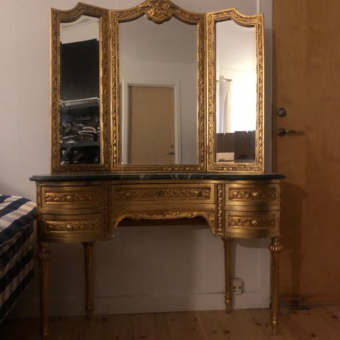 Art Deco makeup-bord med to skuffer i træ, stålramme og bordplade i grå-hvid marmur, dateret ca. 1900–1910, i god stand med aldersrelaterede slidmærker. Klik på den blå "gå til varen" knap, for at købe eller byde på denne vare. Den samlede pris vil blive vist inden du afgiver dit bud.