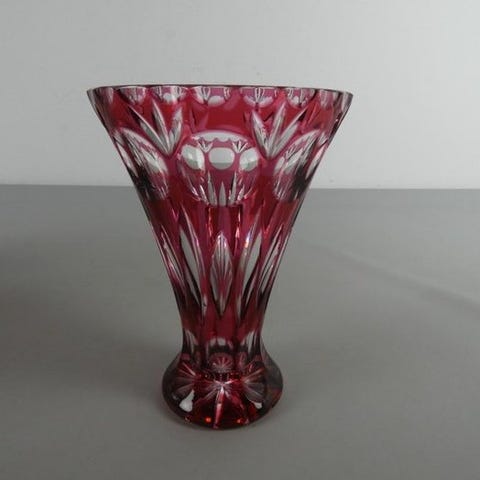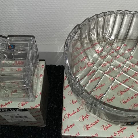 til salg står et elegant konvolut af blykrystal fra den anerkendte fabrik Nachtmann. Sættet består af en stor hankelskål, en fodskål samt en vase og overbeviser med det dybegrønne overfangsglas med aflagt slebet dekor. Originaletiketter findes delvist stadig.