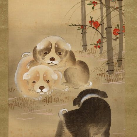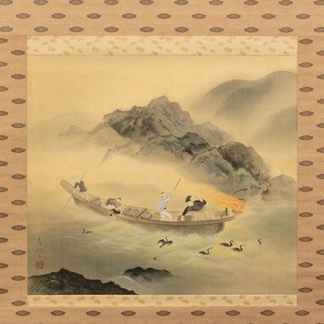 Hængende rullemaleri med original trææske - Yasuda Kosen 安田光僊 (1944-) - Sakura kagaribi 桜かがり火 (Sakura-blomster og bål) - Japan - Showa-æraen
