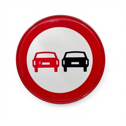 Dit originale Duitse trafiksymbol er et kraftfuldt eksempel på funktionelt grafisk design fra anden halvdel af det tjuende århundrede. Skiltet udtrykker et tydeligt forbud mod at standse eller parkere – et trafiksystem, der anvendes steder hvor standsetkørsel ikke er tilladt af sikkerheds- eller gennemstrømningsårsager.