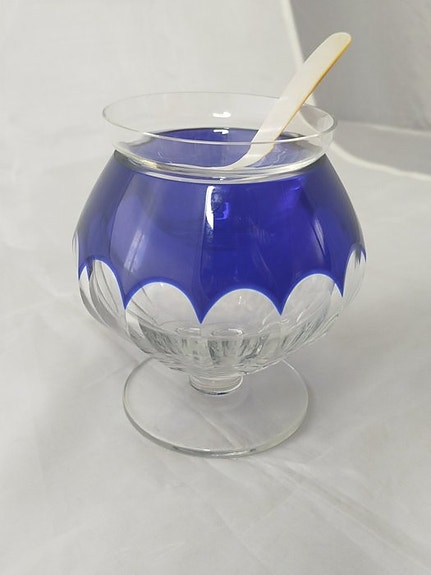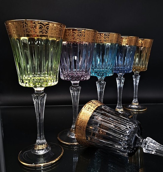Kroppen i glas, fint bearbejdet med geometrisk diamanter mønster og central kartuche, giver genstanden en ekstraordinær lysstyrke, idet lyset afspejles skarpt og skaber en dekorativ effekt med stor effekt. Karaffen skiller sig ud ved sin elegante tilstedeværelse og ved sin evne til at fremhæve enhver indstilling, både som funktionelt element og som dekoration.
