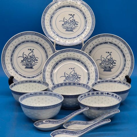 til salg står et dekorativt porcelænsservicestel med traditionel blå og rød dekoration. Sættet kombinerer klassiske blomstermotiv med geometriske kanter og fine gyldne accenter i asiatisk stil.