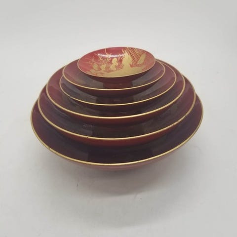 Særdeles smukt japansk sæt bestående af 5 lågskåle med tilhørende 5 underkopper, i porcelæn dekoreret i den rige Imari-stil. Arbejde fra Arita, Meiji/Taishō-perioden, omkring 1880–1920.