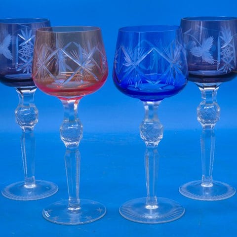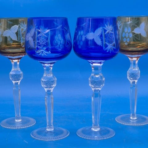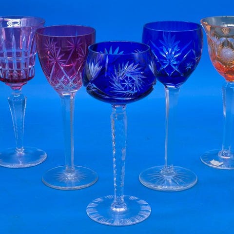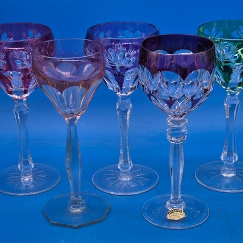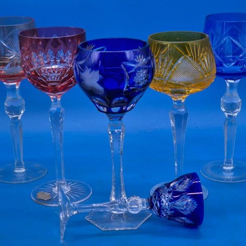 til salg står et elegant sæt bestående af seks farvede romglas af blykrystal. Glasserne imponerer med deres fint slebne dekor med blomsterlige og drueagtige motiver samt de karakteristiske facetede stilke og strukturerede standfødder.