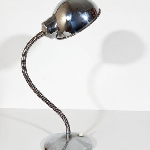 Industriel stållampe til bordet fra Nederlandene, dateret 1990–2000, i god brugt stand med mindre tegn på alder, med trebenet base, justerbart hoved og en metal gitter omkring lysstofrøret, i funktionsdygtig stand. Klik på den blå "gå til varen" knap, for at købe eller byde på denne vare. Den samlede pris vil blive vist inden du afgiver dit bud.