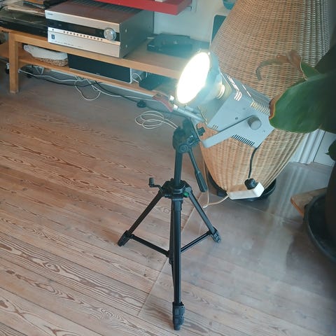 The Theater Lamp, vintage trekantstativ med stagelight fra Holland, fremstillet i aluminium, stål og teaktræ, 170 cm høj, basen 35 cm bred og 25 cm dyb, vægt 13 kg, i god brugt stand med små aldersrelaterede tegn og i funktion, inklusiv stikkontakt, kabel og E27-sokel. Klik på den blå "gå til varen" knap, for at købe eller byde på denne vare. Den samlede pris vil blive vist inden du afgiver dit bud.