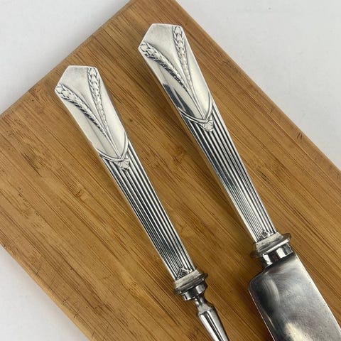 Hver del har et slankt, let flared håndtag med dekorative gulddetaljer ved halsen og enden, der danner et stiliseret blomster/ventil-motiv. Den to-tone finish skaber en sofistikeret kontrast, der passer til både formel dining og forhøjet daglig brug.