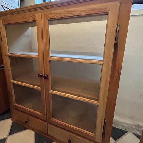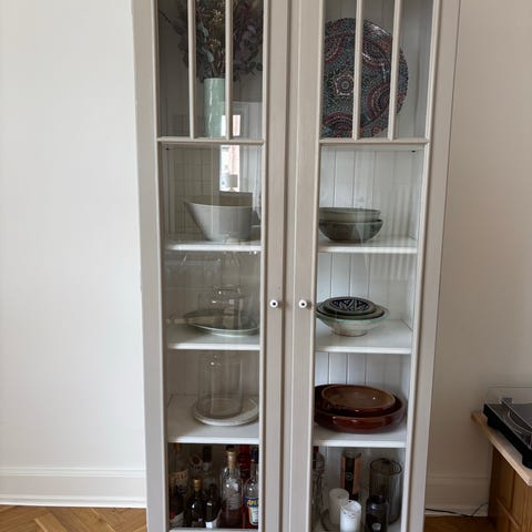 Bag glasdørene er der tre rummelige hylder – ideelle til porcelæn, glas eller dekorationer. Nederst to lukkede låger til diskret opbevaring. De originale messinggreb er en smuk detalje der holder på det klassiske udtryk.