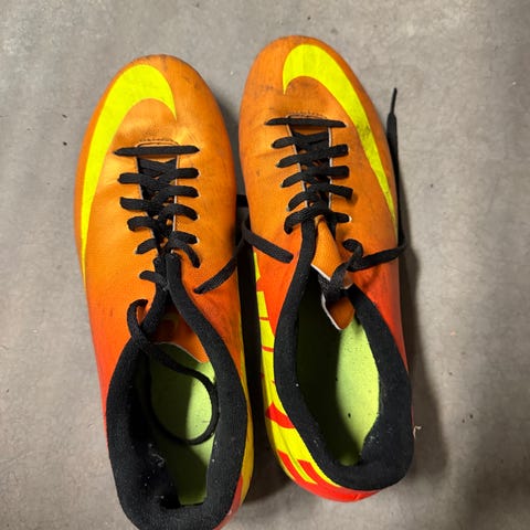 Nike fodboldstøvler i orange og sort med snørelukning. Overdelen er udformet med struktureret overflade på forfoden. Ydersålen har faste knopper, der er velegnede til brug på græsbaner. Modellen har lavt skaft og er egnet til fodboldtræning og kampbrug.