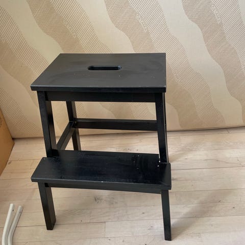 IKEA skammel “Bekväm” i god stand med to trin i sortmalet træ. Skamlen har et øverste trin med greb/udskæring i midten og et lavere trin foran, som giver ekstra højde og stabilitet. Velegnet som hjælp til at nå høje hylder eller som ekstra siddeplads i hjemmet, f.eks. i køkken, børneværelse eller entré. Fra ikke-ryger-hjem.