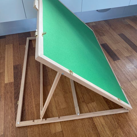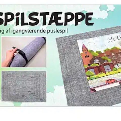 Puslespilsmåtte i grå filt til brug på bord. Måtten dækker en stor del af bordpladen og har flere udtrækssektioner i siderne samt mindre bakker i enderne til sortering af brikker. Egnet til opbygning og opbevaring af puslespil, så arbejdet kan flyttes eller sættes til side uden at forstyrre motivet. Materialet er blød filt, som beskytter både bordoverflade og puslespilsbrikker.
