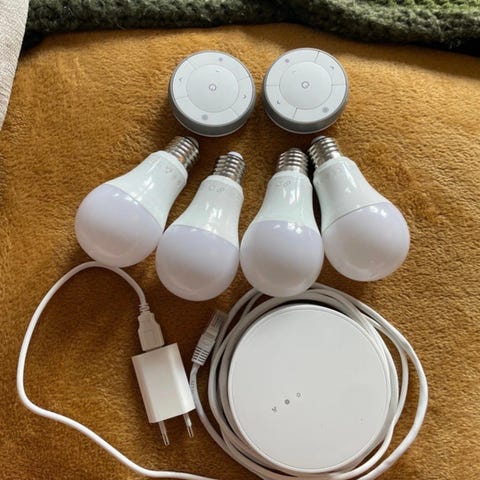Skal du i gang med smart belysning? Medfølger en bridge, kontakt og 3 GU10 pærer. Så kan du komme i gang med det samme!