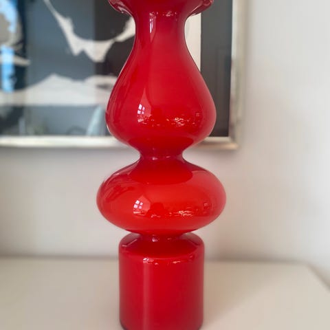 Glas, Carnaby vase, Holmegaard, Carnaby vase fra Holmegaard i rød med inderside af hvidt opalglas og overfang af klart glas, designet af Per Lütken og produceret på Fyns Glasværk i 1968 - 1976. Højde 16 cm, diameter 12,5 cm.
