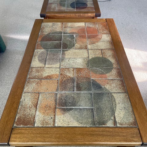 Sæt med 2 kakkelborde i teak, som fremstår flot med blå fliser.