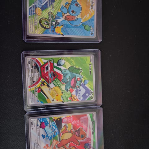 Pokémon samlekort med motiver af Charmander, Bulbasaur og Squirtle. Kortene har farverige illustrationer og leveres i plastlommer, som beskytter overfladen.
