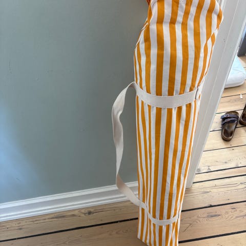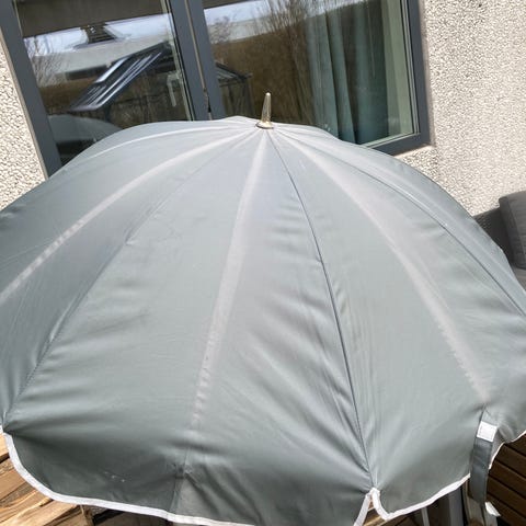 Parasol i grå farve med rund skærm og midterstang. Parasollen har håndtag og justeringsmekanisme på stangen, som gør det muligt at indstille højden. Velegnet til brug på terrasse, altan eller i haven for at give skygge over bord eller siddeplads. Har kun været brugt ganske lidt er ikke falmet. Er afskallet lidt på stangen. Er købt i Altan butikken og er af god kvalitet. Måler 130 cm i diameter.
