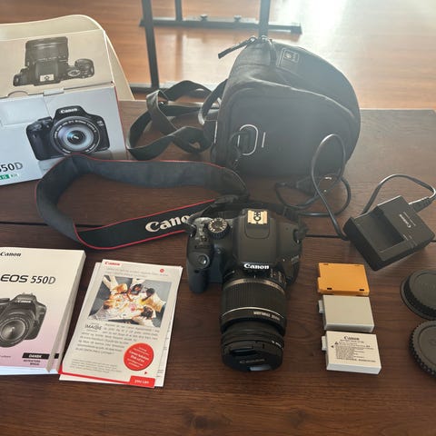 Kameraet er et udmærket "fortsætter" spejlreflekkamera specielt med et EF 55-200mm f/4.5-5.6 zoomobjektiv. Oplader medfølger.