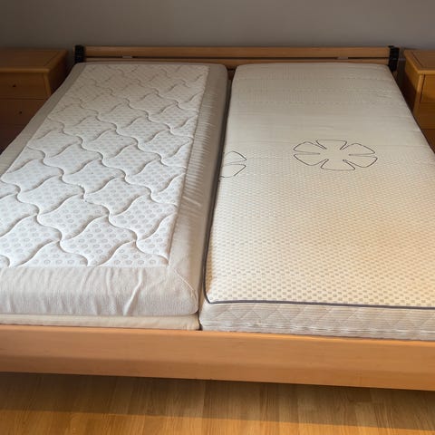 2 stk senge med madrasser, fjernbetjeninger og meder/ben i træ.