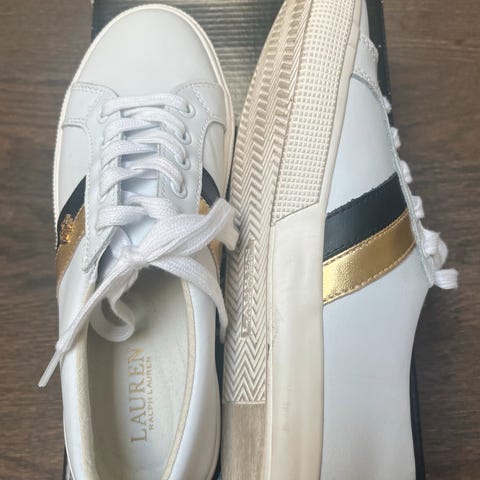 Ralph Lauren sneakers i størrelse 38. Modellen er i hvid farve med guld-detaljer og snørelukning. Overdelen fremstår i glat materiale, og sålen er mønstret for bedre.