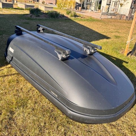 Thule tagboks i grå. Tagboksen monteres på bilens tagbøjler og giver ekstra opbevaringsplads til bagage, udstyr eller lignende. Den åbnes fra siden og har låsesystem med nøgle. Velegnet til brug ved rejser, ferier og transport af let gods på bilens tag.