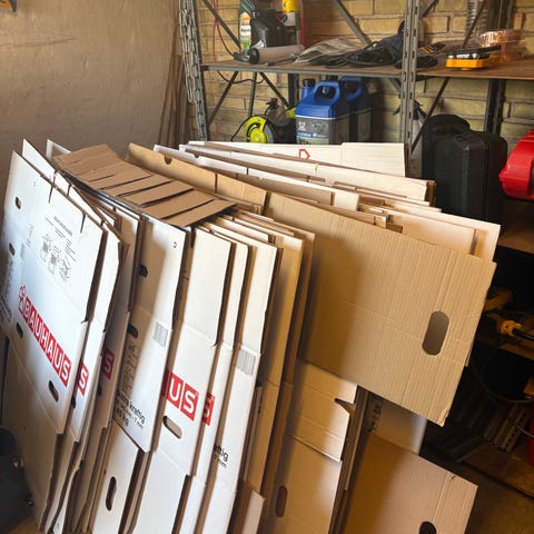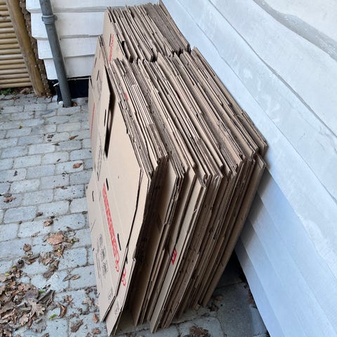 Bauhaus Senior flyttekasser i brun pap. Kasserne er mærket med målene L: 650 mm, B: 370 mm, H: 340 mm og en maks. belastning på 20 kg.
