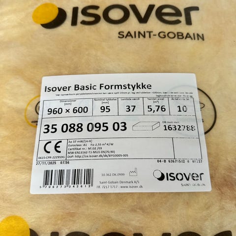 Isover Basic glasuld isolering i både ruller og formstykker. På billederne ses bl.a. Isover Basic Formstykke 960 x 600 x 95 mm og 900 x 600 x 70 mm samt Isover Basic Rulle 7000 x 960 x 95 mm.