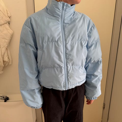 Modellen er en kort dunjakke i polyester. Da fyldet falder ned i bunden skal man ente sy mellemlinjer på eller bruge den som overgangsjakke/mild vinterjakke. Vi har vendt bunden i vejret og rystet den hver morgen, og det har fungeret fint.