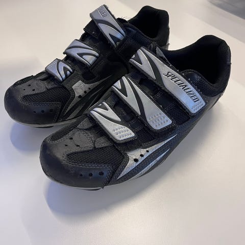 Specialized Body Geometry cykelsko i størrelse 46. Skoen er sort med røde detaljer og indvendig polstring. Den har kombination af drejespænde og to velcrostropper for justerbar pasform. Overdelen er i syntetisk materiale med ventilationsfelter. Ydersålen er designet til cykling med mønster, der giver greb ved gang. Velegnet til brug med klikpedaler, afhængigt af monteret klampe-system.