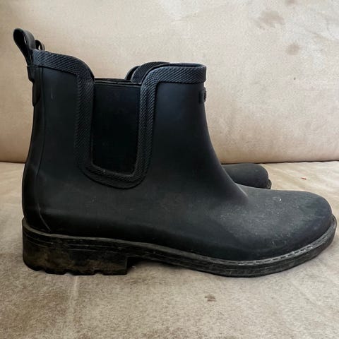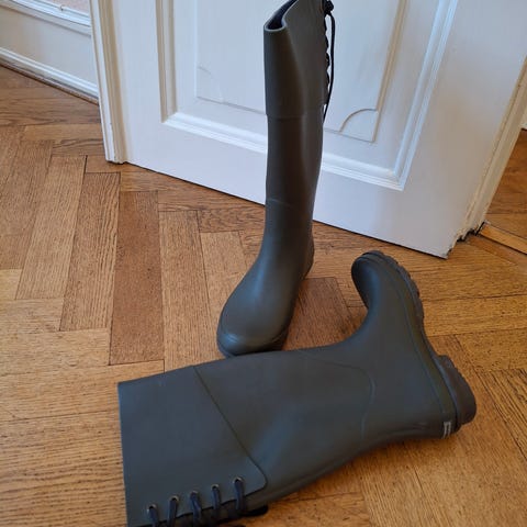 Vagabond gummistøvler i størrelse 38. Kort model med snørelukning foran og kraftig sål. Støvlerne er i sort naturgummi med glat overflade og med stof indvendigt.