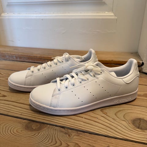 Adidas Stan Smith sneakers i størrelse 40. Modellen er i hvid med grøn hælkappe og klassisk Stan Smith-logo på pløsen. Overdel i glat skind og foret med skind samt perforerede striber i siderne og snørelukning. Flad gummisål.