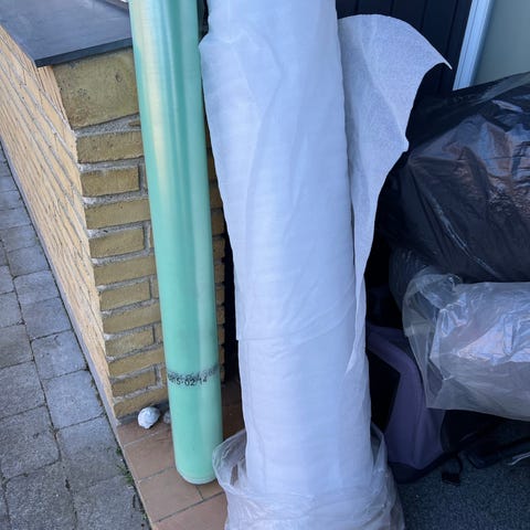 Plastmembran og foam under klikgulv. Den grønne rulle 16 m x 2. Og den hvide er der 13 x 1 meter.